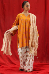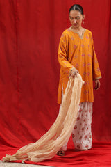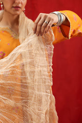 Sheer organza dupatta featuring a softly crinkled texture with subtle metallic linear detailing throughout. Finished with delicate tassel accents, adding lightness and graceful movement to the look.