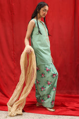 Sheer organza dupatta featuring a softly crinkled texture with subtle metallic linear detailing throughout. Finished with delicate tassel accents, adding lightness and graceful movement to the look.