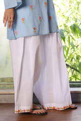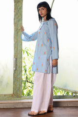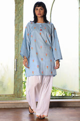 Embroidered classic-fit shirt with a round neckline and buttoned front placket. Paired with a coordinated farshi shalwar, finished with embroidered detailing along the hemline.