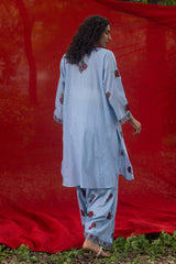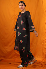 Hand block printed classic-fit paneled shirt with a round neckline and V-slit, adorned with delicate stitching details. Paired with a coordinated printed classic-fit shalwar.