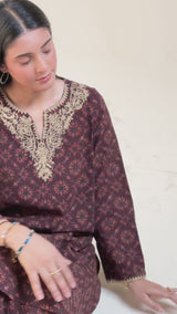 Classic-fit printed shirt with a round neckline and V-slit, adorned with delicate embroidered detailing on the neckline and sleeve hems. Paired with matching printed culottes.