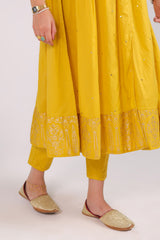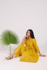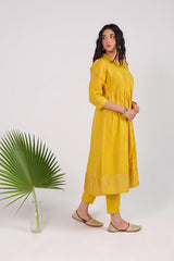 A flared foil-printed shirt with an overlap V-neckline, adorned with button and stitching details. Gathers at the empire waist add volume, while mukaish work enhances the overall charm. Paired with sleek cigarette trousers for a balanced silhouette.