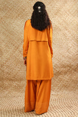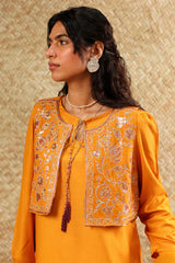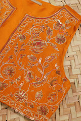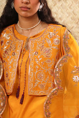 Classic straight-fit shirt designed with a round neckline and tassel accents, complemented by subtle puff sleeves. Layered with a delicately embroidered short sleeveless front-open koti featuring intricate threadwork and sequin detailing. Paired with a farshi shalwar finished with refined stitching details. Styled with a sheer organza dupatta adorned with fine embroidery and sequin work, and completed with scalloped edging for a festive look.