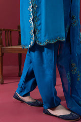Embroidered classic-fit shirt with scalloped sleeve hems and side slits, detailed with embroidery and sequin accents. Features soft puff sleeves and loop-button detailing at the back. Paired with a pegged shalwar with button detailing along the side slit, and finished with an organza, sequin-embellished scalloped dupatta for a festive statement look.