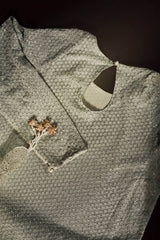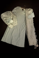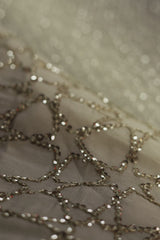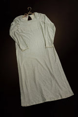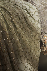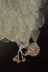 Embroidered long kameez accented with fine threadwork and subtle sequin highlights. The round neckline flows into a refined teardrop back, finished with soft pearl detailing. Fully lined in soft cotton silk for a rich yet comfortable feel. Paired with a classic farshi shalwar, detailed with embroidery and delicate sequins. Styled with a sheer organza dupatta, adorned with scalloped edges and finished with gota and pearl tassels.