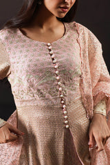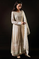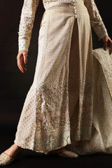 Heavily embellished open-front shirt with a round neckline accented with pearls along the front. Richly embellished with threadwork, pearls and sequin work along the front and back. The fitted sleeves feature layered embroidery and embellishments along with pearl detailing and a button closure. Paired with fully lined chiffon culottes embroidered in complimentary motifs. comes with a matching organza dupatta fully laden with sequin embellishments and handmade gota and beaded tassels.