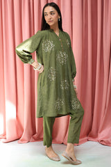 Hand-embroidered classic-fit shirt with a low band neckline and gilded button detailing along the placket, accented with subtle sequin work. Soft gathers on the shoulders and cuffed sleeves add structure. Paired with straight-fit trousers for an effortless look.