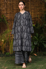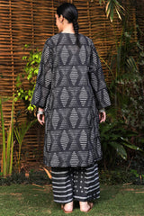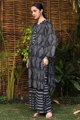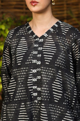Shibori-printed classic-fit shirt with a V-neckline and a bold printed placket. Paired with coordinated printed culottes.