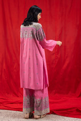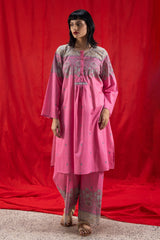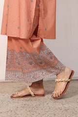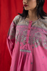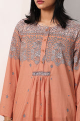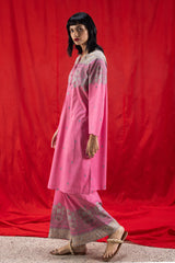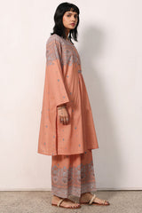 Classic-fit printed shirt with a round neckline and a buttoned front placket, designed with gathers for a softly flared silhouette. Paired with coordinated printed culottes.