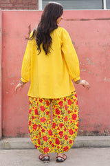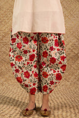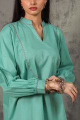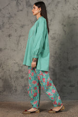 Classic-fit shirt with a low band neckline, enhanced with delicate stitching detail along the neckline, side slit, hemline and cuffed sleeve hems. Thoughtfully designed for a refined silhouette and paired with a coordinated printed balloon shalwar.