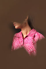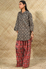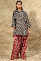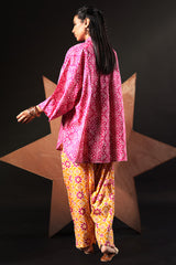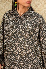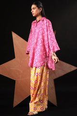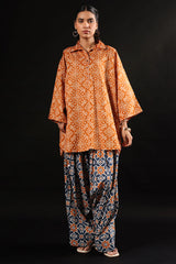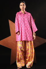 Relaxed-fit printed shirt with a collared neckline and buttoned front placket. Designed with subtle drop shoulders, a rounded hemline, and delicate pleats at the back for a flowing silhouette. Paired with a coordinated printed farshi shalwar.