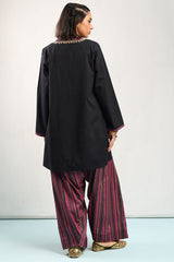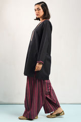 Classic-fit shirt with a round neckline and V-slit, adorned with Susi-patterned detailing along the neckline and sleeve hems, and enhanced with delicate embroidery along the neckline. Paired with a Susi-patterned farshi shalwar for a coordinated, traditional look.
