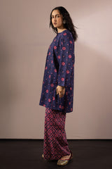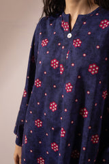Printed classic-fit paneled shirt with a round neckline and V-slit, adorned with button accents. Paired with coordinated printed culottes.
