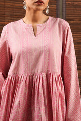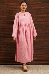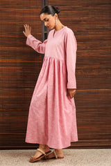 Soft printed long gathered dress with a round neckline and V-slit, featuring gathers around the empire waist for a flattering, flowy silhouette.