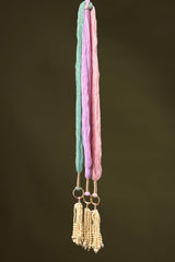 Pastel silk pearl paranda, delicately crafted and finished with cascading pearl tassels, a refined statement that completes the look.