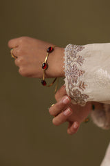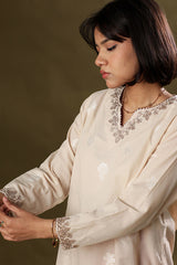 Crafted in jacquard, this classic-fit shirt is adorned with delicate embroidery along the neckline and sleeve hems, elevated with refined gota lace accents. Paired with a coordinating jacquard khula poncha shalwar, finished with gota lace detailing at the hemline.