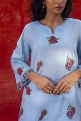 Hand block printed classic-fit paneled shirt with a round neckline and V-slit, adorned with delicate stitching details. Paired with a coordinated printed classic-fit shalwar.