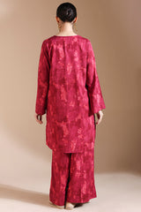 Denim-textured classic-fit printed shirt with a round neckline and V-slit, adorned with tassel detailing. Paired with matching printed culottes.