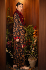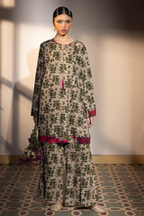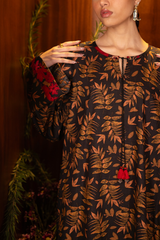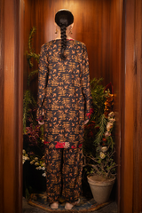 Leaf printed classic-fits shirt with a round neckline and V-slit, adorned with tassel detailing. Paired with matching printed classic culottes.