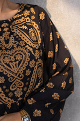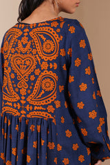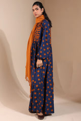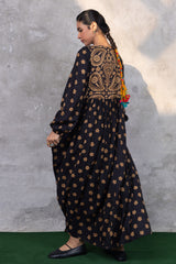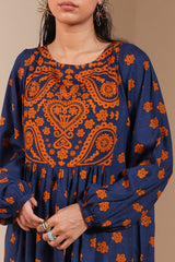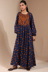 Classic-fit long flared printed dress with a round neckline, featuring gathers around the bodice for a graceful flared silhouette. Finished with cinched sleeves for a refined, feminine touch.