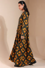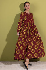Classic-fit long flared printed dress with a round neckline and V-slit adorned with tassel detailing. Gathers around the empire waist create a graceful, flared silhouette.