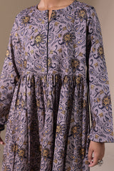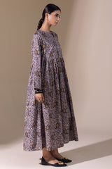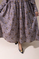 Long flared gold-printed dress with a round neckline and V-slit, adorned with tassel detailing. Gathers around the empire waist create a graceful, flared silhouette.