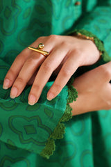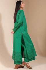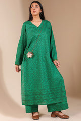 Hand-block printed classic-fit shirt with a V-neckline adorned with bead embellishment along the front slit and lace detailing on the sleeve hems. Paired with culottes featuring matching printed borders.