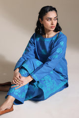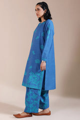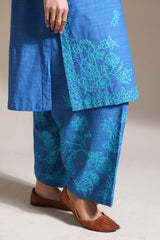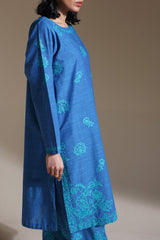 Delicately embroidered paneled shirt with a round neckline and V-slit. Paired with an embroidered khula poncha shalwar.