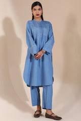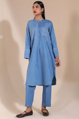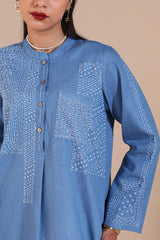 Sashiko embroidered shirt with a low neckline and a buttoned front placket. Delicate stitching accents the bodice and sleeves, finished with a rounded shirt hem. Paired with straight-fit trousers for a refined, easy look.