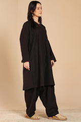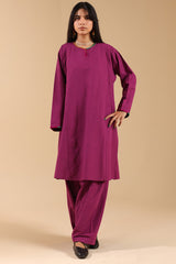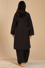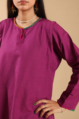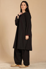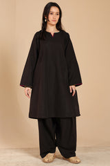 Classic-fit paneled kurta with a round neckline and V-slit, adorned with delicate, Colorful stitching along the neckline and sleeve hems. Paired with a khula poncha shalwar.