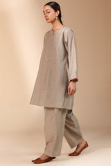 Paneled kurta with a round neckline and V-slit, finished with delicate stitching along the neckline and sleeve hems. Paired with a classic farshi shalwar.