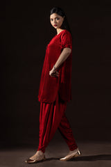 Textured velvet classic-fit shirt featuring tassel detailing at the neckline and bow-tie accents on the sleeves. Designed with a rounded shirt hem. Paired with a matching velvet tulip shalwar for a refined festive look.