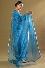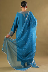 Embroidered speckled-base shirt crafted with a refined finish, enhanced by delicate embroidery around the neckline and sleeve hems. Paired with tailored straight-fit trousers and a soft inner for added comfort. Styled with an airy organza dupatta, enriched with lurex accents and finished with kiran lace edging.