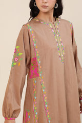 Hand-embroidered paneled shirt with a round neckline and V-slit, adorned with delicate embroidered detailing. Designed with cuffed sleeve hems. Paired with classic culottes finished with subtle stitching detail along the hemline.