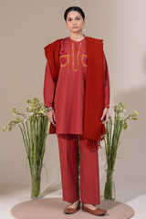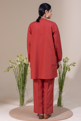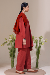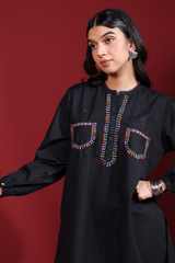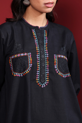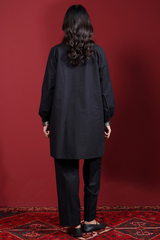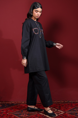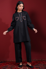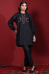 Hand-embroidered classic-fit shirt with a low band neckline and an overlap placket adorned with delicate embroidered detailing. Features fine stitching detail along the neckline and cuffed sleeves. Paired with culottes.