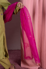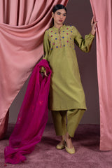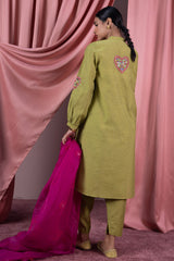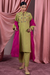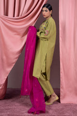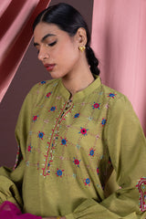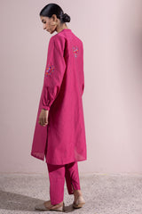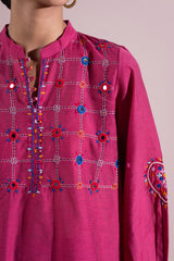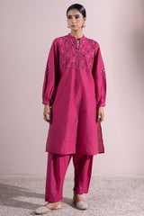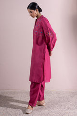 Hand-embroidered classic-fit shirt with a low band neckline and loop detailing along the front slit. The hand embroidery is adorned with mirror accents, complemented by cuffed sleeve hems. Paired with a classic-fit shalwar featuring subtle side slits.
