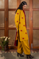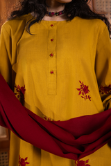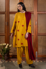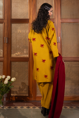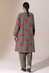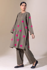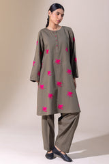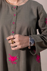 Hand-embroidered classic-fit shirt with a round neckline and buttoned front placket. Delicate embroidered motifs enhance the overall design. Paired with a classic-fit shalwar.