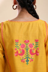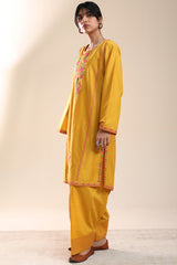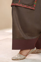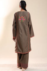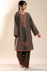 Embroidered classic-fit paneled kurta with a round neckline, accented by delicate stitching details. Paired with a classic farshi shalwar, finished with subtle stitching along the edges.