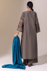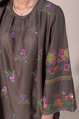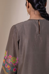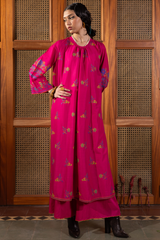 Gul-embroidered relaxed-fit shirt with a round neckline, featuring subtle gathers. Delicate cross-stitch embroidery enhances the artisanal charm. Finished with scalloped sleeve hems and paired with culottes adorned with embroidered scalloped borders.
