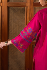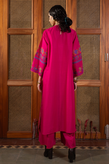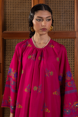 Gul-embroidered relaxed-fit shirt with a round neckline, featuring subtle gathers. Delicate cross-stitch embroidery enhances the artisanal charm. Finished with scalloped sleeve hems and paired with culottes adorned with embroidered scalloped borders.