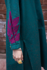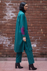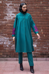 Appliquéd classic-fit shirt with a low band neckline, adorned with delicate stitching detail and a buttoned front placket. The cuffed sleeves features appliqué and embroidered work, finished with crochet lace along the hems. Paired with speckled straight-fit trousers.