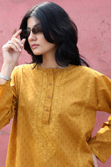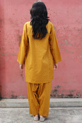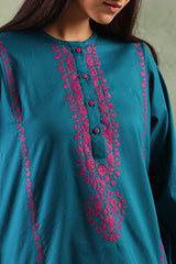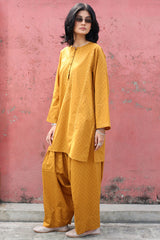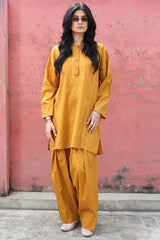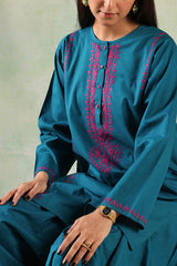 An embroidered paneled classic-fit shirt with a low band neckline and buttoned front placket. Paired with a khula poncha shalwar for an effortless, traditional look.