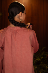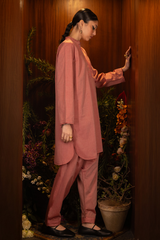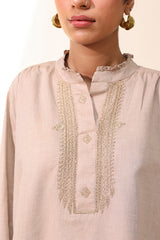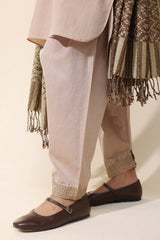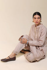 An embroidered classic-fit shirt with a low band neckline and buttoned front placket, adorned with frill detailing on the neckline and sleeve hems. Finished with a round shirt hem and paired with a classic-fit shalwar featuring embroidered detailing on the ankle hemline.