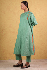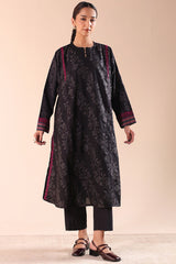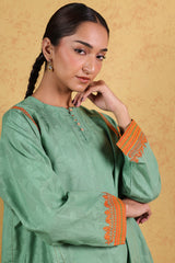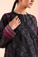 Jacquard paneled kurta with a round neckline, detailed with pleats and buttons along the front slit. Delicate embroidery enhances the shoulders, side slits, and sleeves, complemented by jacquard-patterned sleeve hems. Paired with classic straight-fit trousers for a refined, coordinated look.