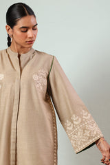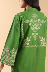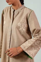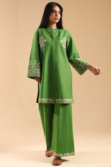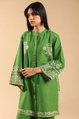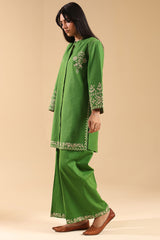 An embroidered classic-fit shirt with a low band neckline and front slit, featuring subtle drop shoulders. Paired with classic culottes, adorned with embroidered detailing along the ankle hemline.