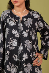 A classic-fit printed shirt with a round neckline and V-slit, adorned with dori tassel detailing. Finished with a rounded hem and paired with a matching printed classic-fit shalwar.