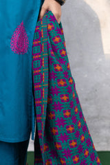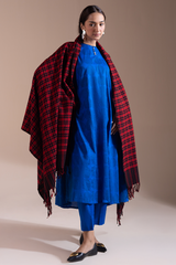 Woven warm shawl featuring geometric patterns and twisted thread fringes along the edges, creating a bold yet playful statement look.