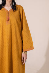 Classic-fit textured shirt with a V-neckline, adorned with delicate embroidered detailing and tassel accents. Finished with embroidered detailing on the sleeve hems. Paired with a textured classic-fit shalwar for a coordinated look.