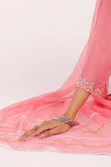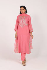 A classic-fit hand-embroidered shirt with a round neckline and V-slit, accented with delicate stitching and tassel embellishments. Paired with straight-fit trousers featuring detailed stitching at the hem, and styled with a dupatta trimmed with golden and silver borders for a graceful, refined finish.