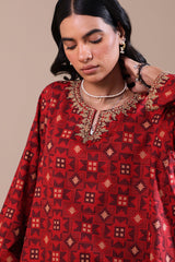 A relaxed-fit A-line printed shirt with a round neckline and V-slit, adorned with delicate embroidered detailing on the neckline and sleeve hems. Paired with matching printed gharara.